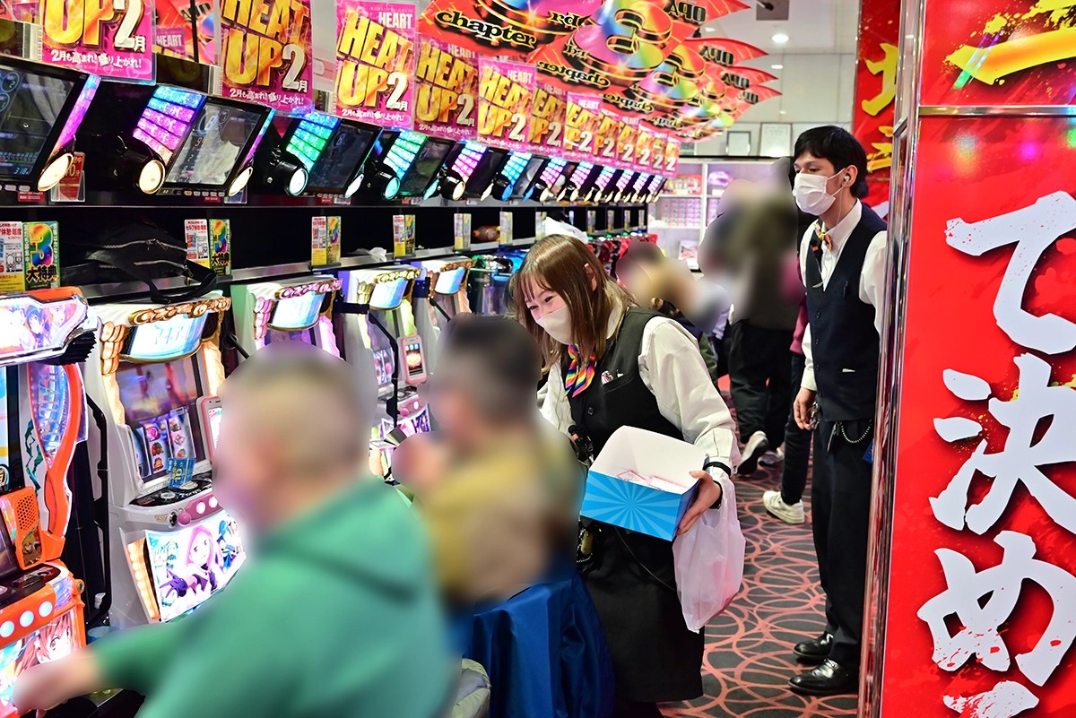 2フロアの同店では、景品カウンター正面の2階にあがる階段前にセット賞品をきれいに陳列し、午後3時30分頃から、両フロア同時に抽選くじを配付。当選者にはスタッフがその場に賞品を持っていき、当たりを称えながら楽しそうに会話が弾んでいる姿がみられました。